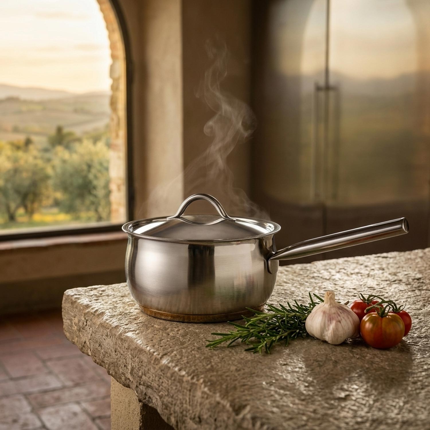 Il corpo della casseruola è realizzato interamente in acciaio inossidabile 18/10, una lega selezionata per la sua resistenza alla corrosione, la neutralità con gli alimenti e la capacità di mantenere la lucentezza nel tempo. L’esterno lucido a specchio riflette la luce con una precisione quasi scenografica, mentre l’interno opaco con scala graduata incisa restituisce praticità senza rinunciare all’eleganza. Non è solo un utensile da cucina: è un oggetto che dialoga con lo spazio intorno a sé.