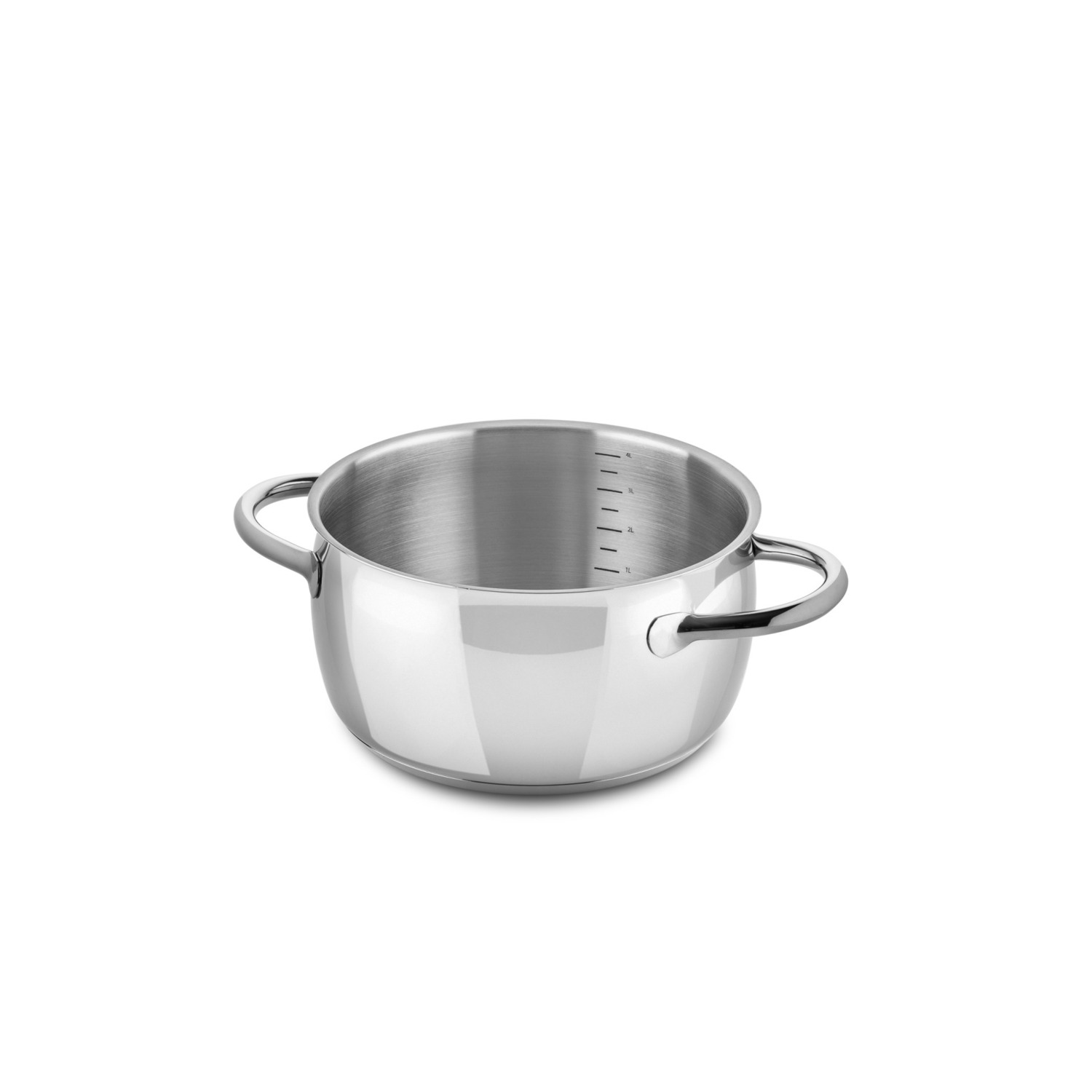 Il corpo della casseruola è interamente realizzato in acciaio inossidabile 18/10, scelto per la sua eccezionale resistenza alla corrosione, la neutralità organolettica e la capacità di mantenere la lucentezza dopo anni di utilizzo e lavaggi. L’esterno specchiato cattura e rimanda la luce con una precisione quasi architettonica, mentre l’interno opaco con scala graduata offre al cuoco un riferimento visivo immediato senza interruzioni estetiche. Una dialettica tra lucido e opaco che è scelta estetica ma anche riflessione sul modo in cui si cucina.