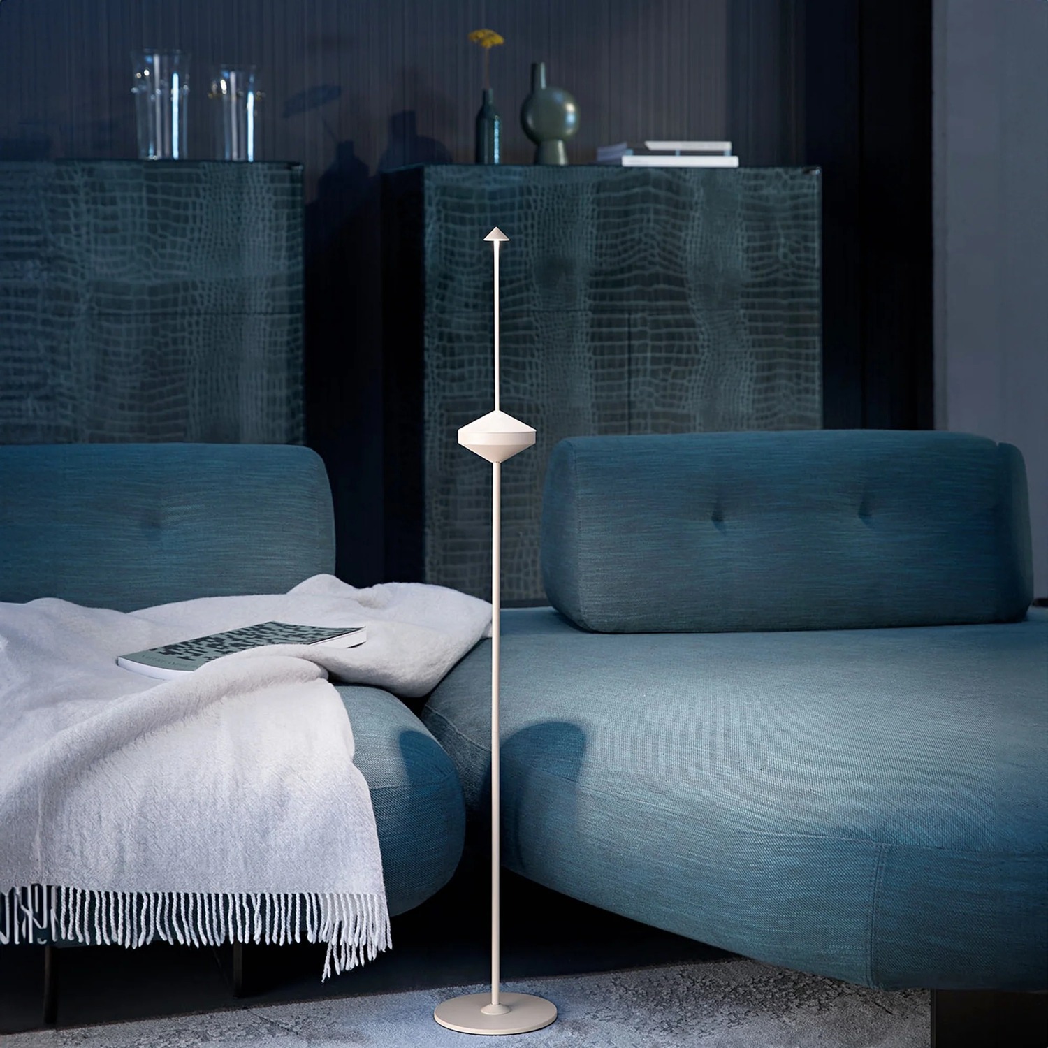 La silhouette della Pina, con lo stelo sottilissimo che si innalza dalla base rotonda fino alla piccola testa conica, ha una qualità quasi scultorea che in questa finitura chiara emerge con particolare evidenza. È una lampada che di giorno funziona come oggetto decorativo a pieno titolo, anche spenta.