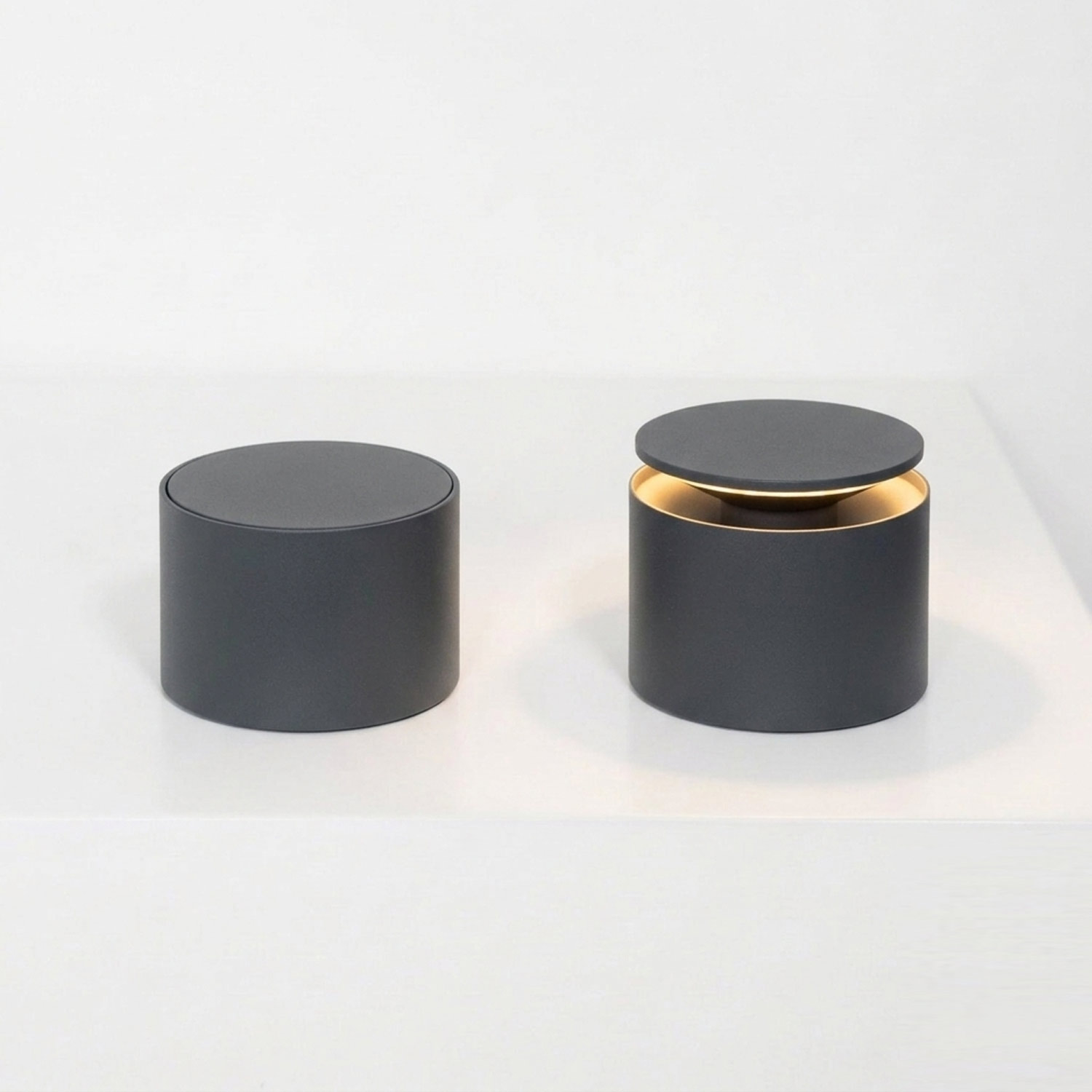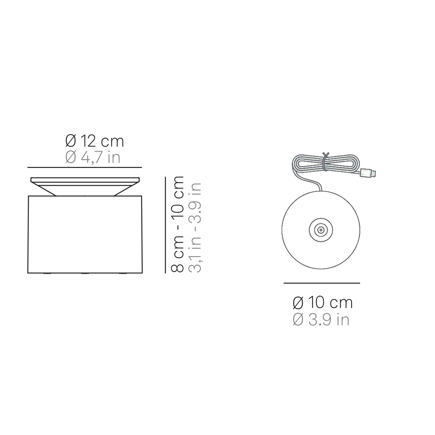 Zafferano ha immaginato questa Push-up Lampe à Porter da tavolo ricaricabile come una fonte luminosa ma anche e forse soprattutto come un pezzo di arredo. Il corpo cilindrico in alluminio pressofuso verniciato, nella raffinata finitura grigio scuro, ha la compattezza e la presenza di una scultura minimal: si posa su un piano e occupa lo spazio con discrezione assoluta, eppure attira lo sguardo con quella sottile linea di luce che separa la base dalla calotta quando la luce è accesa.