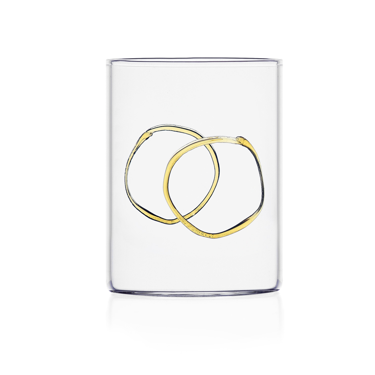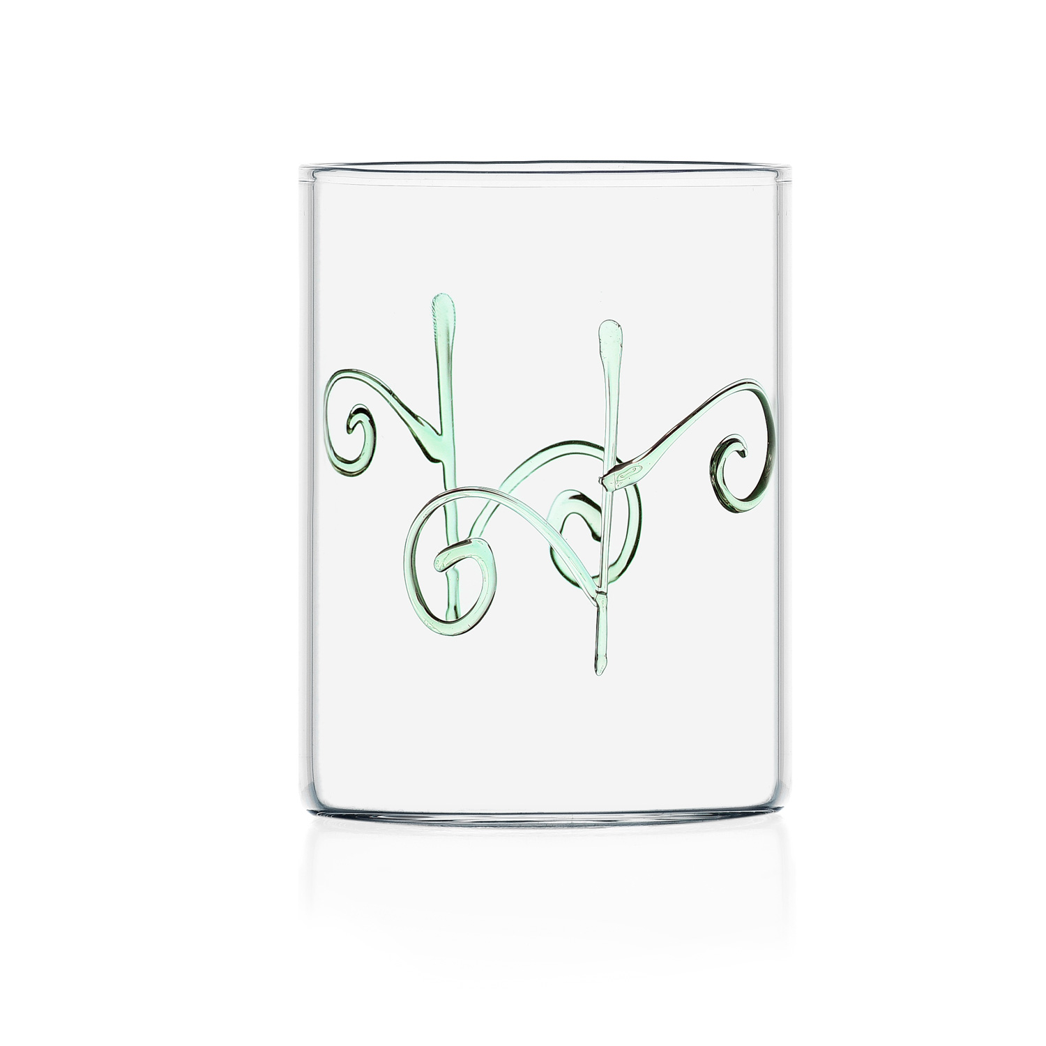 Set composto da bicchieri tumbler fatti a mano e lavorati a lume in vetro trasparente di alta qualità con decorazioni in forme diverse e di colori assortiti.