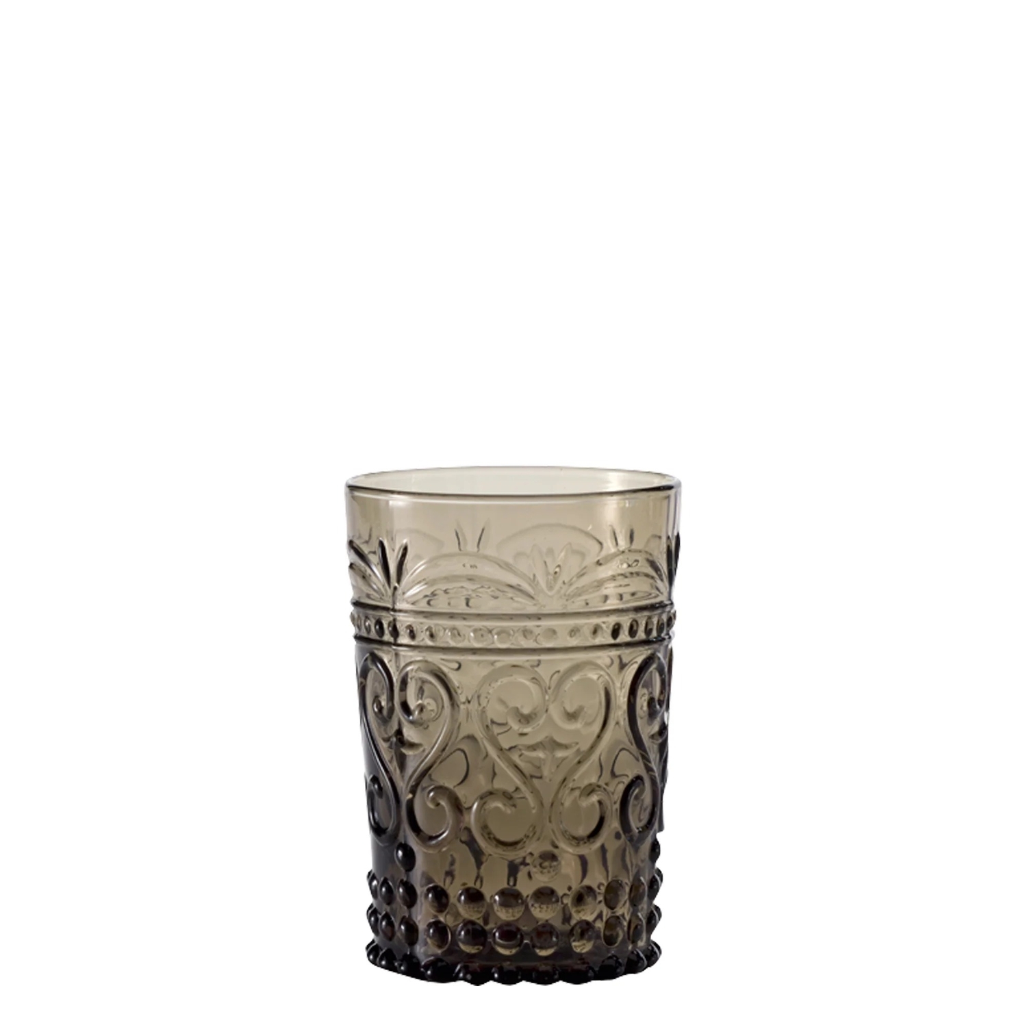 Provenzale Tumbler set da 6 bicchieri monocromatici grigi caratterizzati da un decoro a rilievo romantico di ispirazione francese.