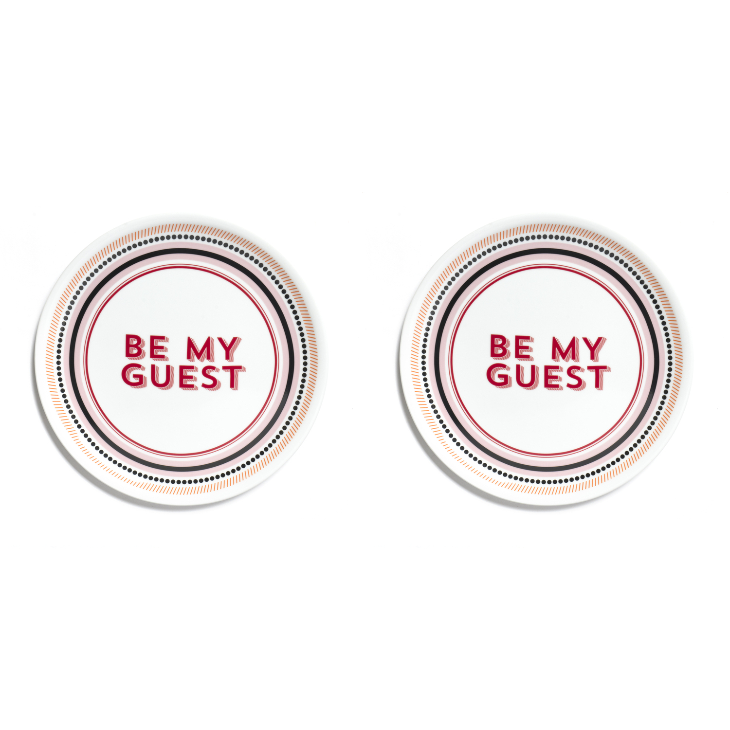 La scritta “BE MY GUEST” è in colore rosso, stampatello e con un effetto tridimensionale al centro bianco del piatto racchiusa da vari bordi concentrici a formare quasi una greca fatta di righe di diverso spessore e trama (fascette rosa e nere, pallini neri, tratteggi arancio). Il testo tradotto letteralmente significa sii il mio ospite che è una espressione inglese per invitare l’ospite a sentirsi a casa propria, accolto.