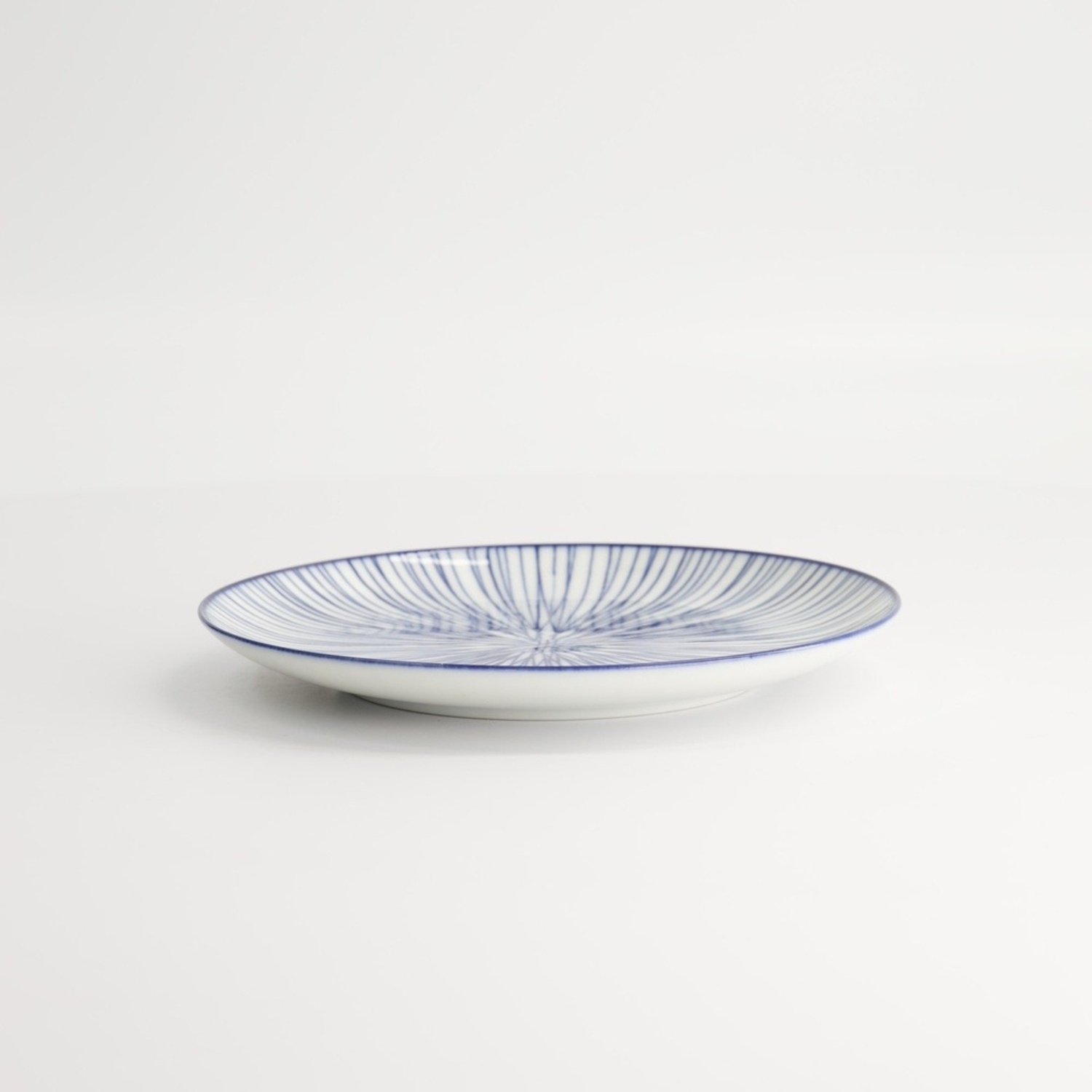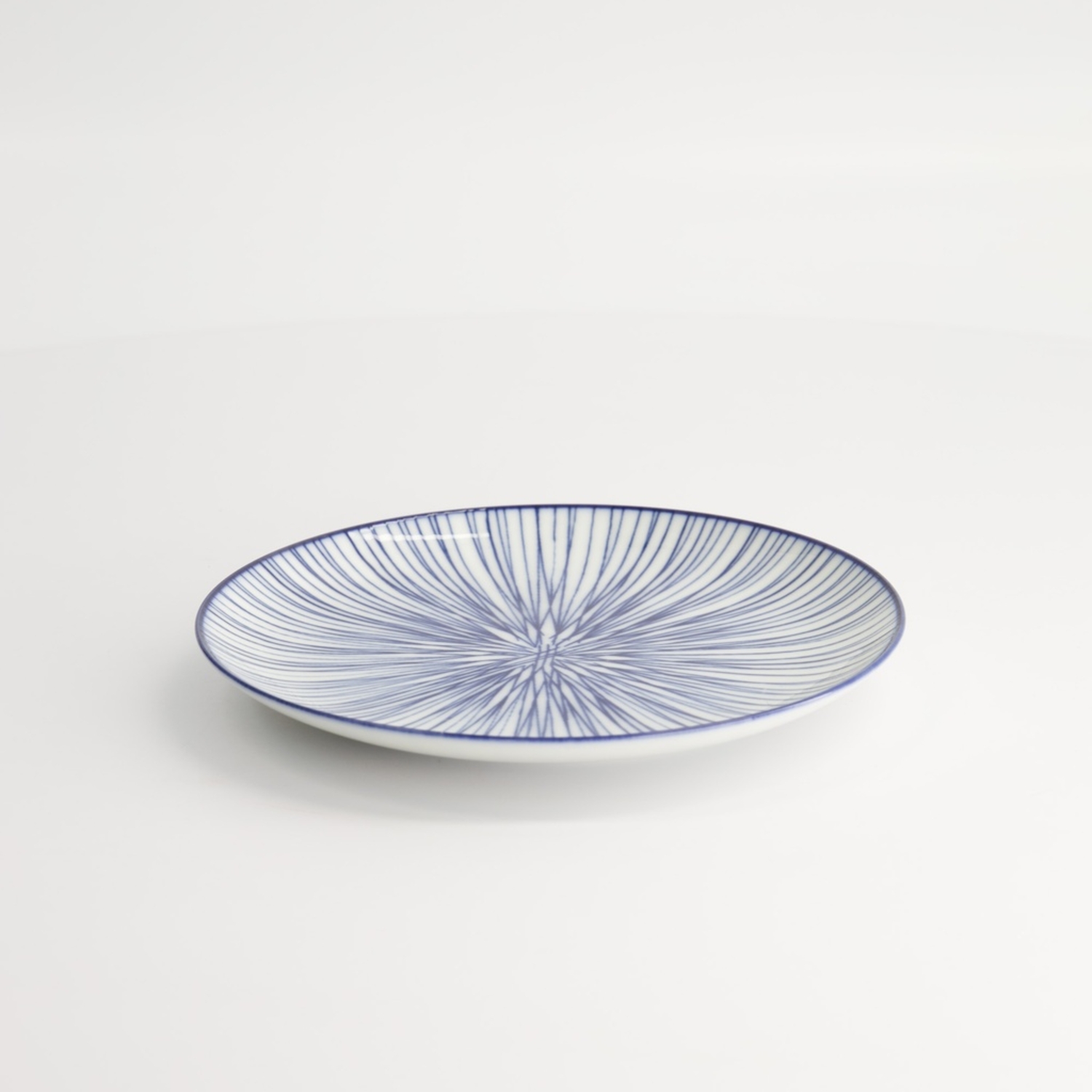 Nippon Blue Plate Lines è un piatto piccolo tondo giapponese in porcellana bianca con decorazione composta da sottilissime righe vicine disposte a raggiera blu.