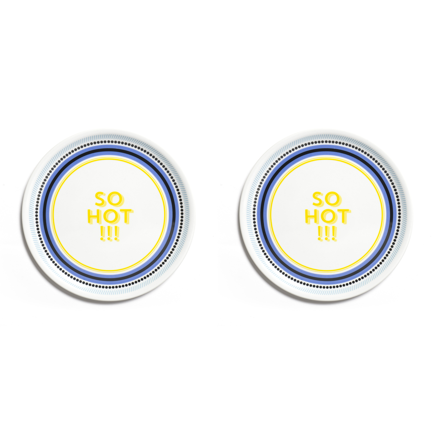 So Hot!!! piatto pizza in porcellana. Serie Guest di Bitossi Home con scritta in maiuscolo e bordi concentrici in vari colori e tratti