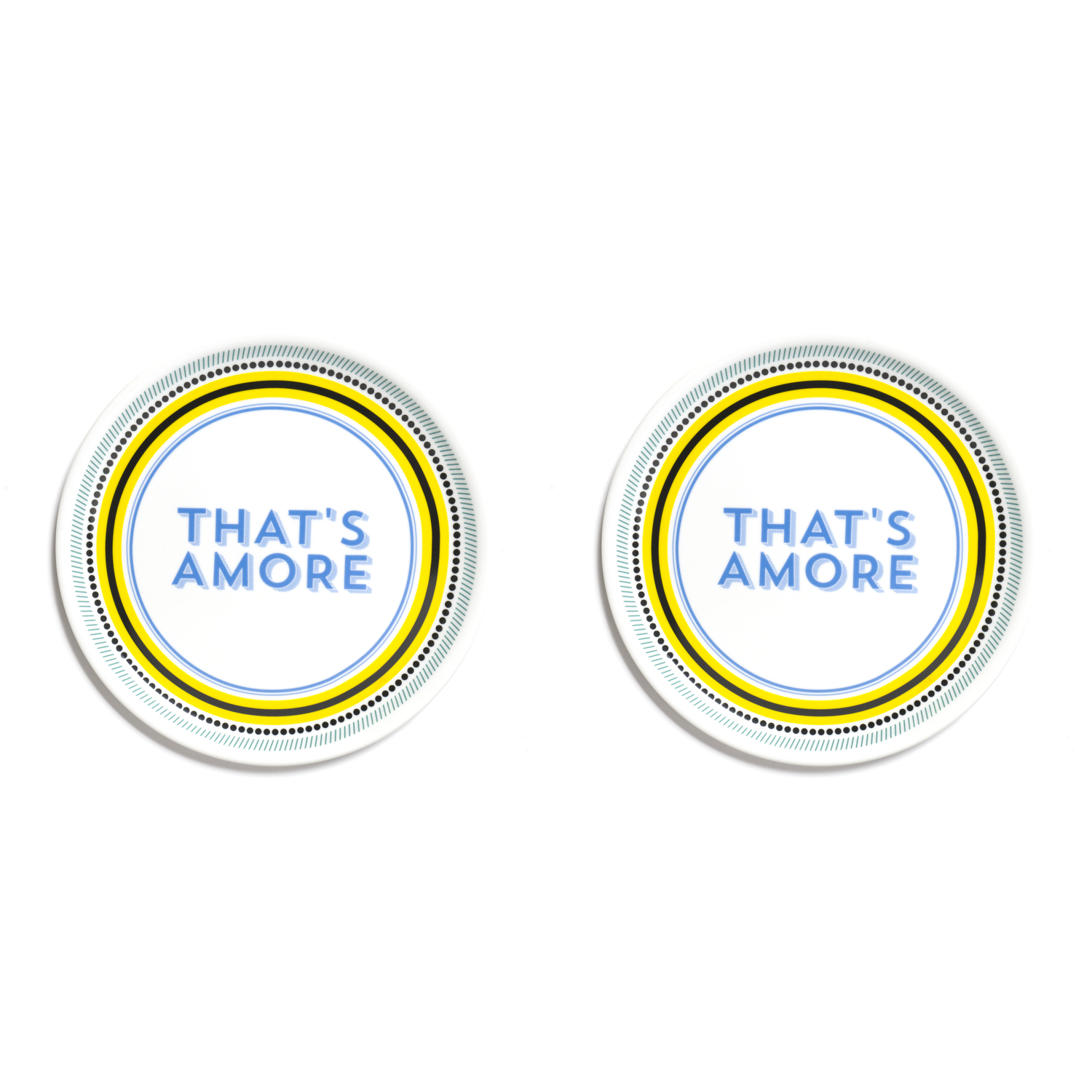 La scritta “That’s Amore (“Quello è Amore”) è azzurra, stampatello, con un effetto tridimensionale al centro del piatto con sfondo bianco. E’ disposta su due righe e circondata da vari bordi concentrici composti da righe di diverso colore, forma e spessore (fascette gialle e nere, pallini neri, tratteggi obliqui azzurri).